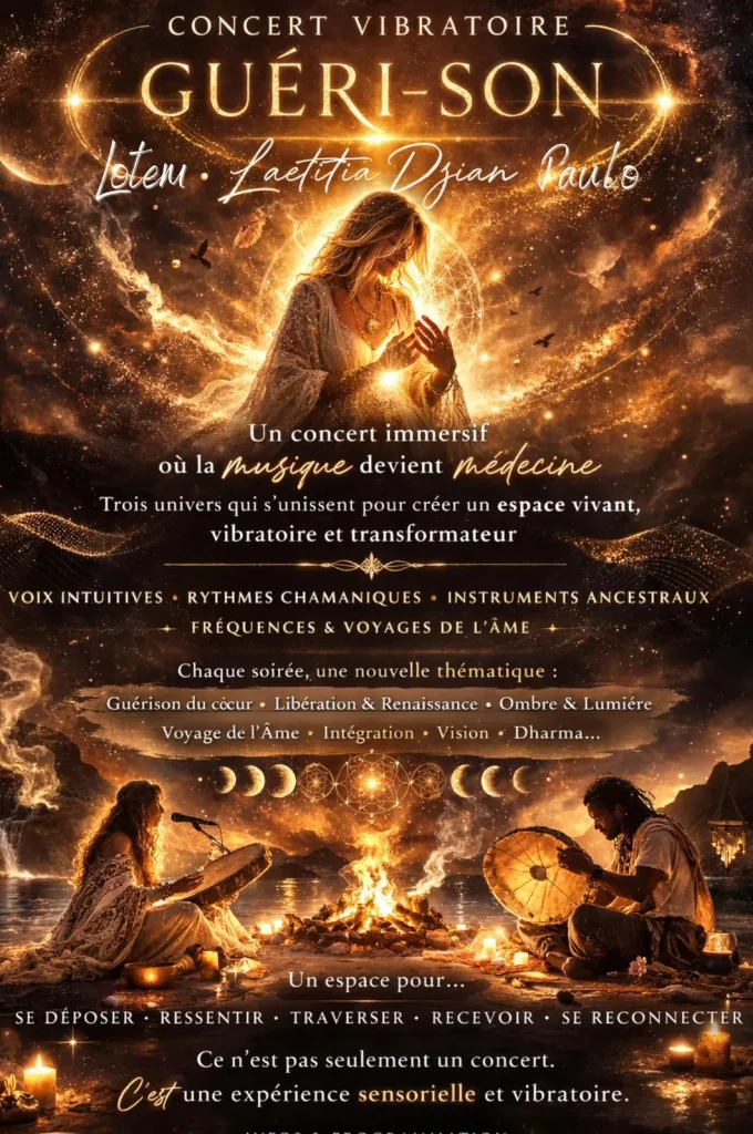 Le 29 mai, je vous donne rendez-vous à la Salle Commodore de Marina Baie des Anges à Villeneuve-Loubet pour le concert vibratoire « Guéri-Son », aux côtés de Lotem et Paulo. Une expérience immersive où la musique, les rythmes chamaniques et les fréquences sonores deviennent un véritable voyage intérieur.